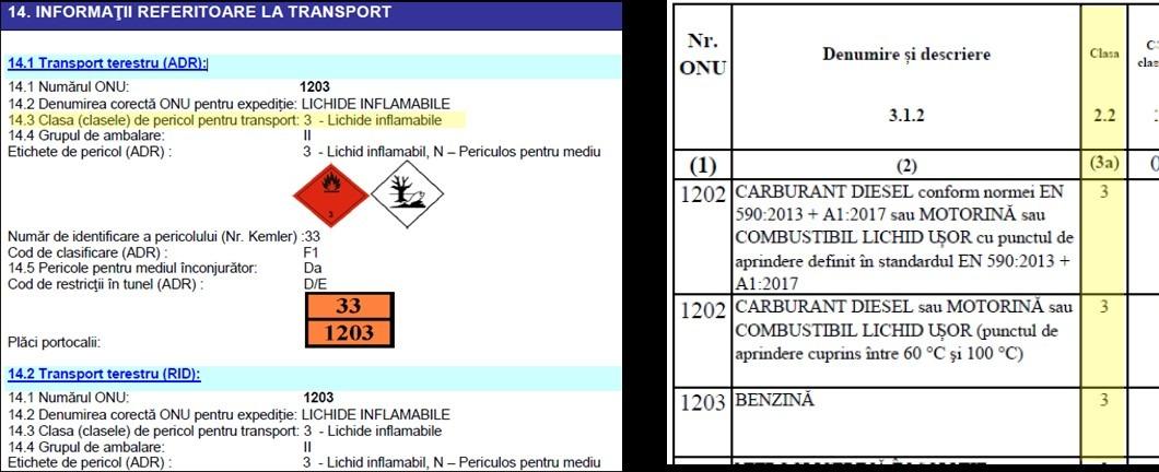 În același timp, clasa de pericol a mărfurilor periculoase poate fi identificată în fișa tehnică de securitate al produsului în care producătorul la punctul 14. menționează informațiile referitoare la transport.