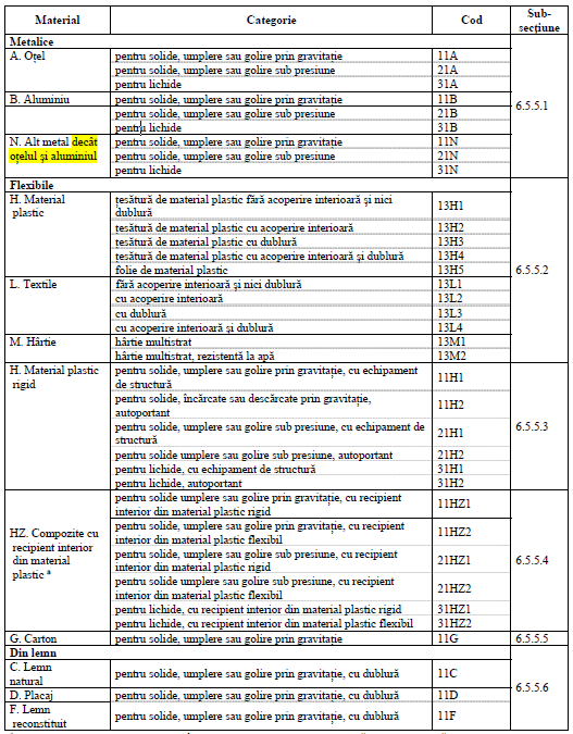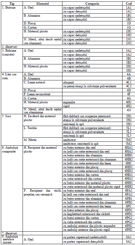 Codurile pentru tipurile de ambalaj autorizate conform Acordului ADR